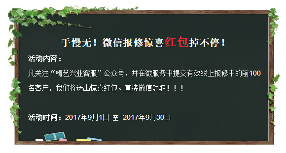 “精藝興業(yè)客服”微信報(bào)修上線啦即日起微信報(bào)修可自主查詢派工及后續(xù)跟蹤處理進(jìn)展,前一百名有效報(bào)修還可領(lǐng)取紅包獎(jiǎng)勵(lì)哦快來關(guān)注我們的微信服務(wù)號(hào),體驗(yàn)線上報(bào)修的快捷吧。