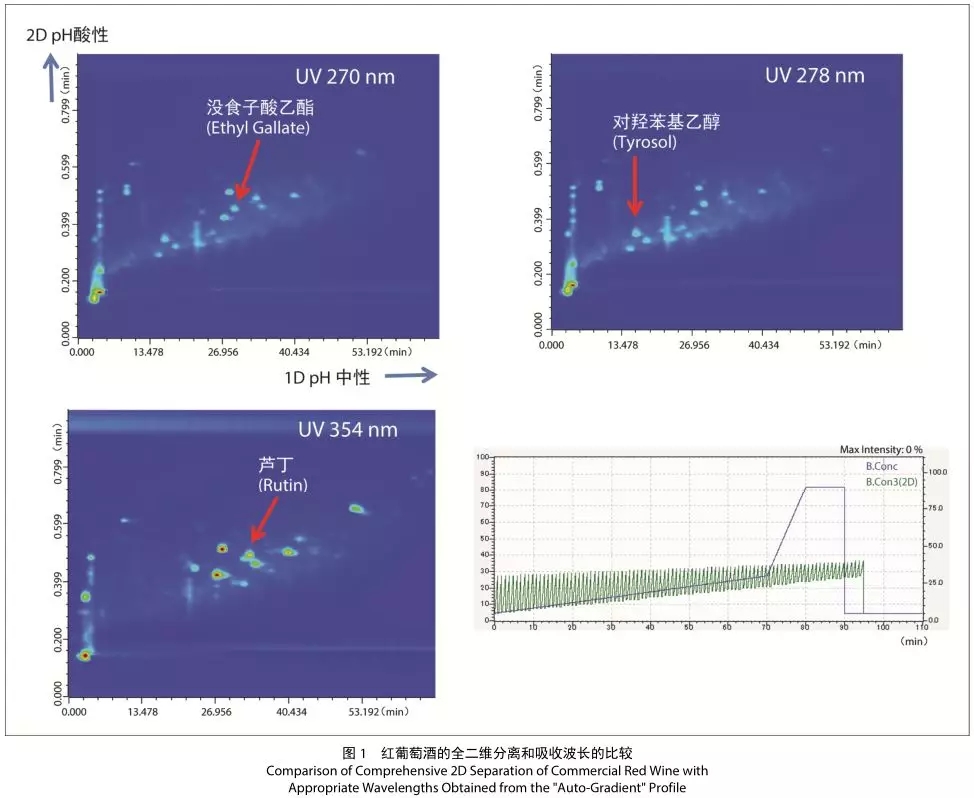 酚類化合物是芳烴的含羥基衍生物。多數(shù)情況下,酚類化合物具有含多個(gè)芳香環(huán)和羥基的結(jié)構(gòu)。眾所周知,多酚類化合物具有抗氧化作用,可有效預(yù)防動(dòng)脈硬化和腦梗塞。因?yàn)榧t葡萄酒含有大量酚酸類及類黃酮類等多酚類化合物,近年來(lái)隨著人們?cè)絹?lái)越注重健康,所以紅葡萄酒也備受矚目。但是,紅葡萄酒中共存成分過(guò)于復(fù)雜,多數(shù)多酚化合物難以通過(guò)常規(guī)的 HPLC 同時(shí)分析進(jìn)行分離定量。但如果使用全二維液相色譜儀 Nexera-e,可有效地進(jìn)行分離。