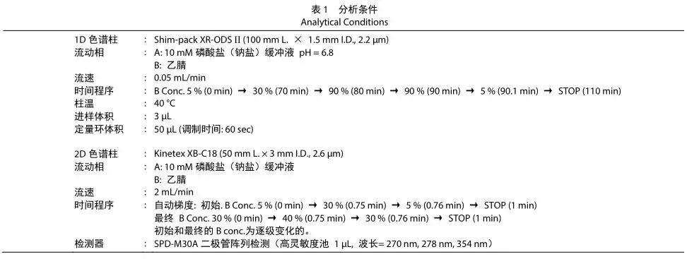 表 1 為分析條件。一維使用中性磷酸緩沖液,二維使用酸性磷酸緩沖液,以反相×反相進(jìn)行了分離。