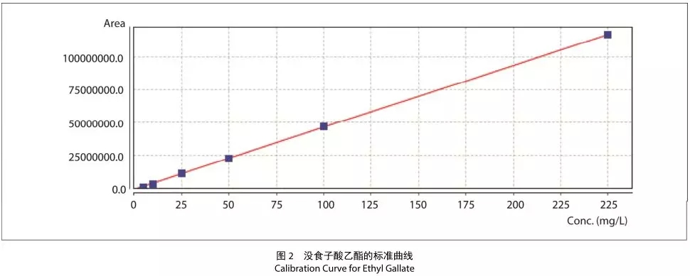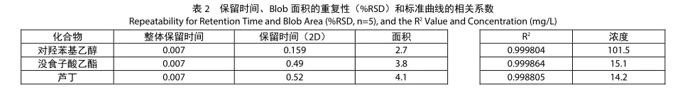 在5-250 mg/L的范圍、6種濃度下創(chuàng)建了各成分的標(biāo)準(zhǔn)曲線。通過(guò) 0.22 μm 的薄膜過(guò)濾器注入了紅葡萄酒。圖 2 為沒(méi)食子酸乙酯的標(biāo)準(zhǔn)曲線;表2為整體以及二維分離系統(tǒng)的保留時(shí)間重復(fù)性、blob 面積重復(fù)性、標(biāo)準(zhǔn)曲線的相關(guān)系數(shù)(R 2 )和各定量值。