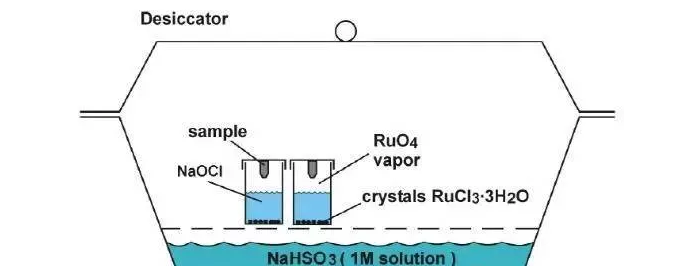 先用雙面膠把樣品塊粘在一個10mL的玻璃小瓶上部,放入少量RuCl3在瓶子底部,用槍加入雙倍的NaClO,蓋上蓋子,反應(yīng)會立即開始。將玻璃小瓶放在干燥器里,最好在加NaClO溶液之前就放在干燥器里。干燥器底部放有一定量的1M NaHSO3溶液,用以吸收多余的RuO4蒸汽。染色完畢后,樣品用水沖洗至少1小時,干燥后切片。