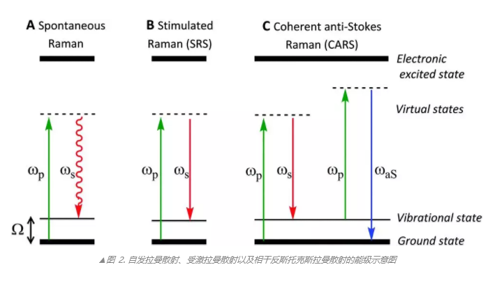 根據非線性光學過程的不同,可將相干拉曼散射分為兩種:相干反斯托克斯拉曼散射(Coherent Anti-Stokes Raman Scattering,CARS)和受激拉曼散射(Stimulated Raman Scattering,SRS)。雖然這兩種非線性光學現象很早就被發(fā)現(上世紀 60 年代),但長期僅作為光譜學測量手段,直到 1999 年以及 2008 年,哈佛大學謝曉亮教授才分別將它們以實用顯微成像技術推廣開來[4][5]。