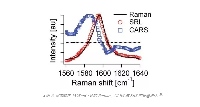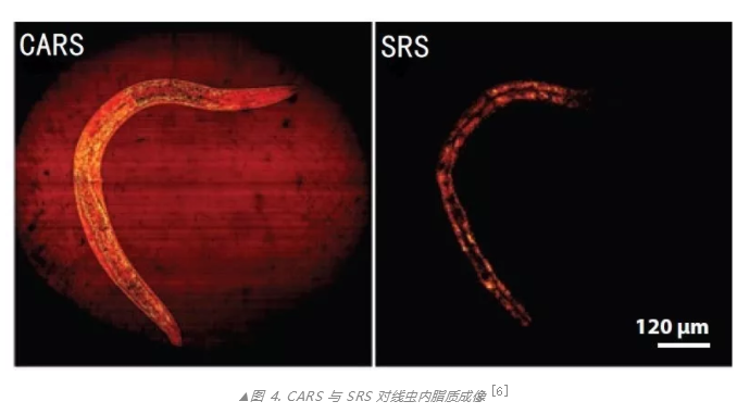 CARS 與 SRS 雖然都是三階非線性光學過程,它們之間有明顯的區(qū)別:CARS 是個四波混頻過程,產生的光子具有第三種頻率——反斯托克斯光子 ωas,因此只需采用合適的濾波片就可以簡單地提取出來;而 SRS 是泵浦和斯托克斯光之間的相互轉化過程,泵浦光子的湮滅和斯托克斯光子的產生同時發(fā)生,但沒有產生第三種光子;因此,通常用泵浦-探測技術中常見的調制解調的方式來提取信號,需要借助鎖相放大器來實現。CARS 顯微成像技術自 1999 年被發(fā)明以來,一直受困于非共振背景信號的干擾,典型的表現為光譜發(fā)生畸變(圖 3)。在苦苦求索了近 10 年之后,謝教授課題組于 2008 年推出了 SRS 技術,完美地解決了上述問題。CARS 過程中能量被封鎖于電磁場/光子中,電子躍遷可繞過分子振動直接通過虛能級產生;而 SRS 的發(fā)生依賴于光子能量與分子振動之間的交換,具有嚴格的共振吸收特征。因此 SRS 在光譜上與自發(fā)拉曼一致(圖 3),在圖像上也不再受非共振背景的困擾(圖 4)。此外,SRS 的信號與分子濃度呈線性關系,更方便于定量解析復雜混合物體系中的各種化學成分。也因為這些特性,SRS 不斷獲得研究者們的青睞。
