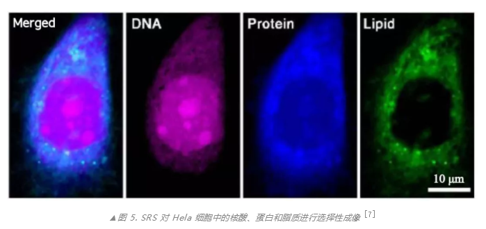 免標記和分子特異性:CRS 成像的信號來源于目標分子本身,無需外源標記物,也避開了藥物小分子等不易標記的問題,在活體(in vivo)觀測上更具有優(yōu)勢;可對具有不同拉曼譜的分子進行選擇性成像,比如生物樣品里常見的脂質、蛋白、核酸和糖類等(如圖 1);