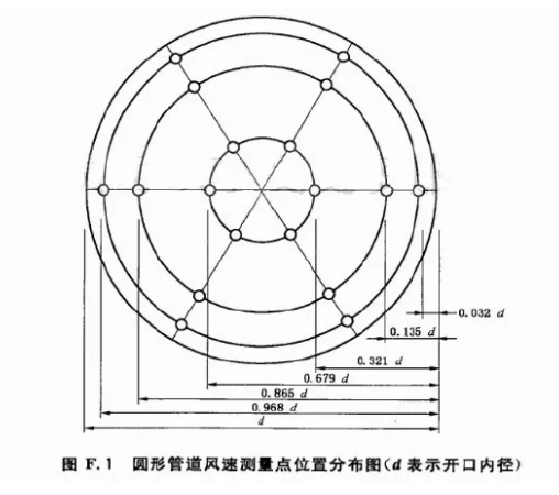 1) YY0569-2011中,測試步驟和方法指出,用風(fēng)速儀插入至附錄圖F.1中的測量點位置,然后算出安全柜的排氣流量。對口徑≤254mm的圓管,3個或2個軸,每個軸上有6個測點;口徑>254mm的圓管,3個或2個軸,每個軸有8或10個測量點。再測得安全柜的供氣流量,最后算出進氣流速。