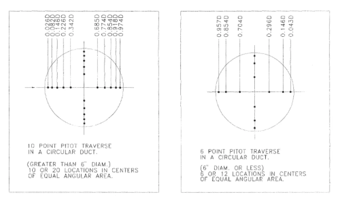2)而NSF49-2018中,指出需要參考“Industrial Ventilation-Testing of Ventilation Systems”用皮托管的方法測量。按照管道直徑,對大于6英寸的管道,2個軸,每個軸10或20個點;對小于6英寸的管道,2個軸,每個軸6個點或者12個點。把皮托管按照測量點放入管道,通過得到的動壓值得到通過管道橫截面的風(fēng)速,在通過測量供氣流量計算得出進氣風(fēng)速。