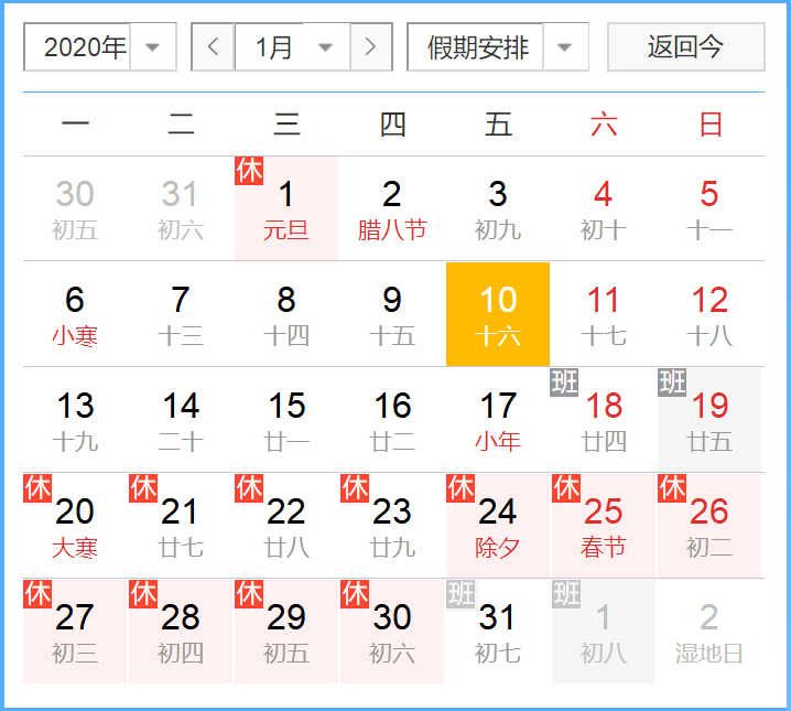 根據(jù)國(guó)家放假規(guī)定及結(jié)合本公司實(shí)際情況,經(jīng)公司研究決定,2020年春節(jié)放假時(shí)間為: 1月20日(周一)至1月30日共11天,1月31日初七上班;其中 1月18日(周六)補(bǔ)班(公司規(guī)定),1月19日(周日)補(bǔ)班(國(guó)家規(guī)定)、2月1日(周六)補(bǔ)班(國(guó)家規(guī)定)。