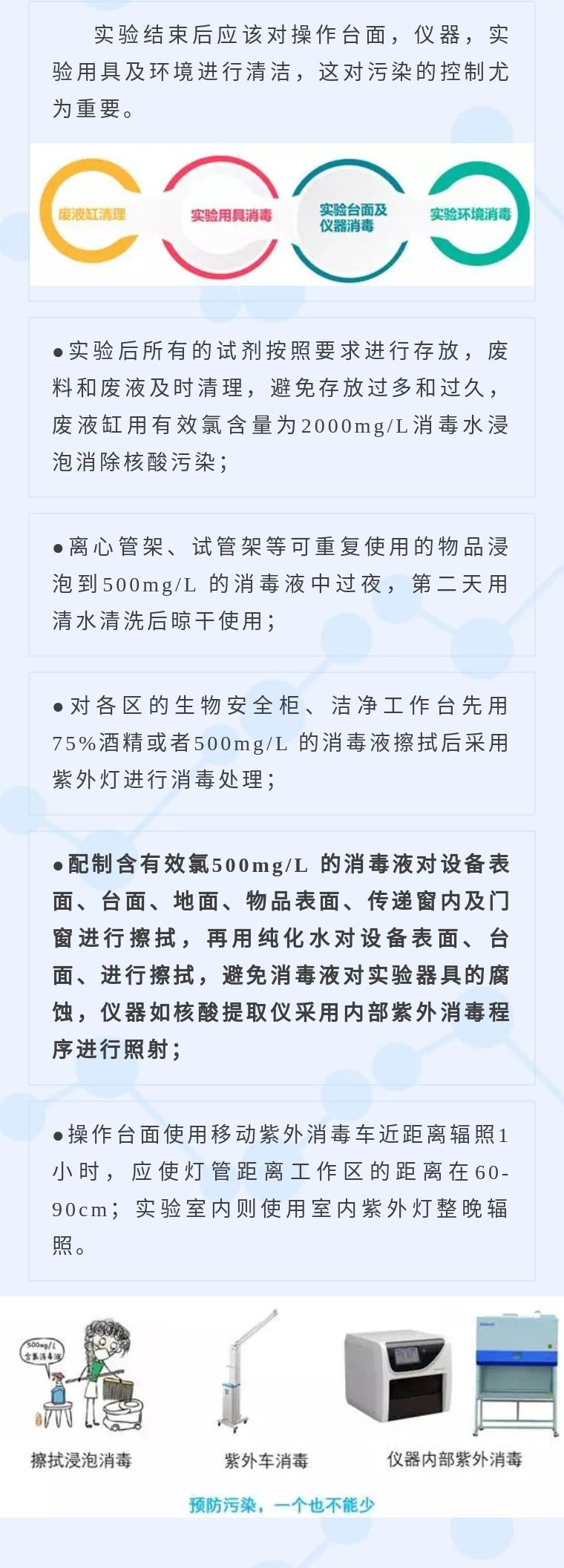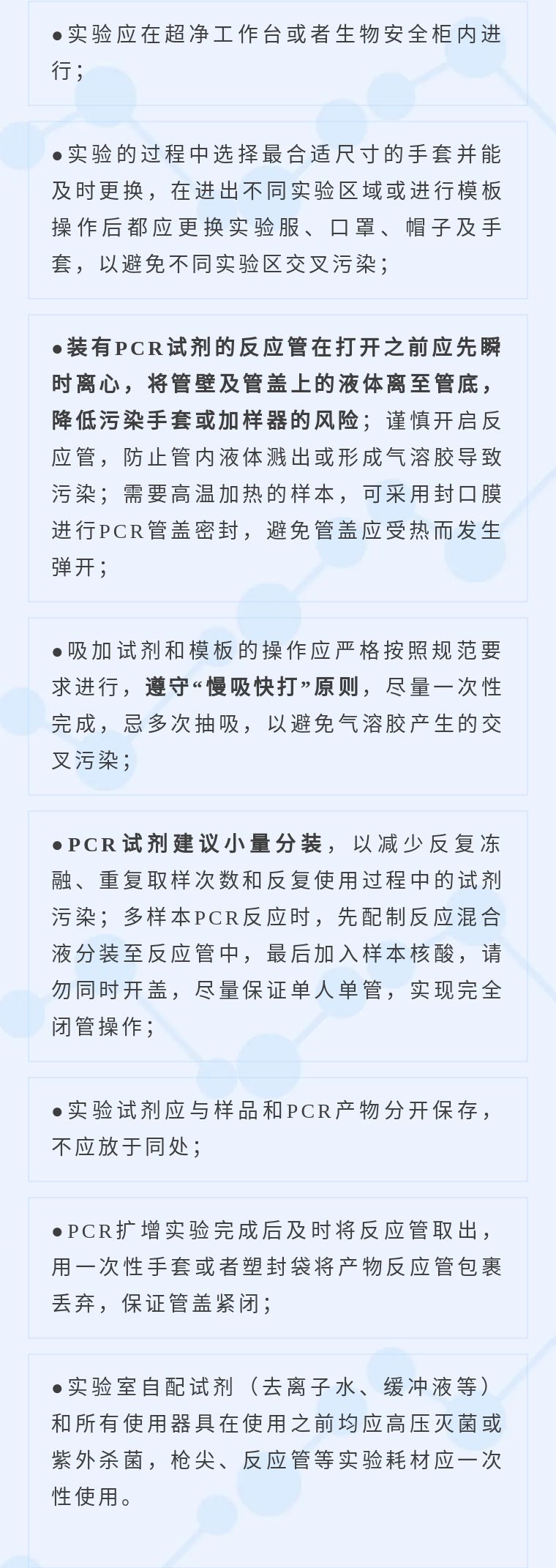 PCR 實驗強大的擴增能力和檢測的敏感性致使極其微量的污染都會導致假陽性的出現(xiàn),所以 PCR 實驗過程中防污染工作是一個不容忽視的問題,不能因為工作的熟練反而松懈下來,每日實驗前和實驗結(jié)束后一定按要求對實驗室進行徹底的清潔消毒,才能把污染的可能性扼殺在搖籃中,避免造成嚴重的損失
