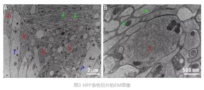 “閃光冷凍”電鏡的拍攝的HPF小鼠急性腦片海馬CA3區(qū)圖像如下:A)低倍鏡圖像顯示青苔狀纖維軸突(綠色箭頭)穿過透明層,CA3錐體神經(jīng)元樹突(藍(lán)色箭頭)穿過青苔狀纖維,少量青苔狀纖維(紅色箭頭)位于這些樹突和軸突之間。B)高倍鏡圖像顯示苔蘚纖維(紅色箭頭)布滿突觸囊泡和苔蘚纖維軸突(綠色箭頭)。優(yōu)化后的實(shí)驗(yàn)體系保留了急性切片最佳超微結(jié)構(gòu),可媲美無光遺傳學(xué)刺激的HPF類器官腦片的超微結(jié)構(gòu)。