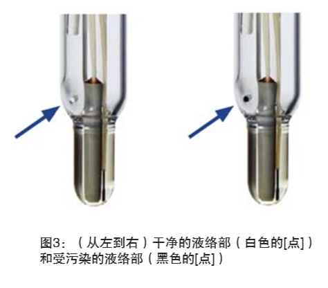 液絡(luò)部和電極玻璃膜一樣容易受到蛋白質(zhì)污染的影響。傳統(tǒng)的陶瓷芯液絡(luò)部,是位于電極玻璃膜上方的一塊玻料。玻料是由小氣孔所構(gòu)成,該設(shè)計(jì)可讓電解液流出電極,并流入樣品中。電解液的流動(dòng)對獲取精確pH結(jié)果非常重要——它會(huì)產(chǎn)生穩(wěn)定的參考電位,并且形成電極的回路。如果電解液不能穩(wěn)定地流入樣品,讀數(shù)的錯(cuò)誤就難以避免。