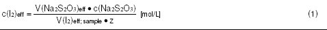 濃度0.05 mol/L和0.01 mol/L的碘儲(chǔ)備溶液的有效濃度 c(I2)eff 采用新鮮配制的0.01 mol/L硫代硫酸鈉標(biāo)準(zhǔn)溶液測(cè)定(見第三節(jié)“化學(xué)試劑”,第2頁)。c(I2)eff 的濃度計(jì)算按式(1)進(jìn)行。