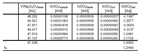 對(duì)空樣本進(jìn)行測(cè)定,是假設(shè)樣品m(SO2)eff = 0,根據(jù)0.01 mol/L硫代硫酸鈉的消耗量m(SO2)det對(duì)其進(jìn)行了計(jì)算。對(duì)根據(jù)式(2)計(jì)算的n(SO2)blank來說,采用平均值V(Na2S2O3)blank = 9.259 mL,而測(cè)定的滴定劑用量V(Na2S2O3)sample用于計(jì)算n(SO2)sample。空樣本或空白值測(cè)定的目的,是為了評(píng)估空樣本的標(biāo)準(zhǔn)偏差se。根據(jù)se,采用式(8)和式(9)計(jì)算LOD XLOD 和LOQ XLOQ。