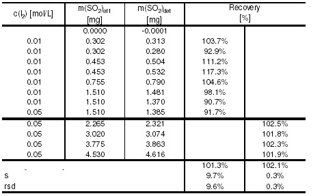 表2:在 SO2-吸收容器內(nèi),采用 0.01 和 0.05 mol/L 碘標(biāo)準(zhǔn)溶液對(duì) SO2 進(jìn)行測(cè)定的校正曲線和回收率。雙線表明如表 3 所示的定量限。