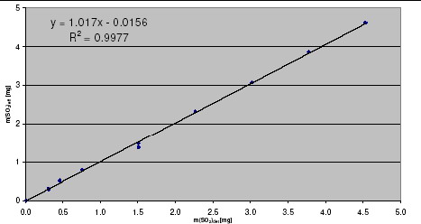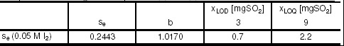 根據(jù)檢測(cè)限和測(cè)定限測(cè)定程序的標(biāo)準(zhǔn) DIN EN 32 645 [2]方法所述,采用有效含量 m(SO2)eff 作為自變量 x,而測(cè)定值 m(SO2)det 作為因變量 y,繪制校正曲線。根據(jù) DIN EN 標(biāo)準(zhǔn),對(duì) LOD 及 LOQ 的測(cè)定來說,要求在 LOQ 附近進(jìn)行十次獨(dú)立測(cè)定,并采用一個(gè)空樣本,以確定 m(SO2)eff = 0 mgSO2 的標(biāo)準(zhǔn)偏差。